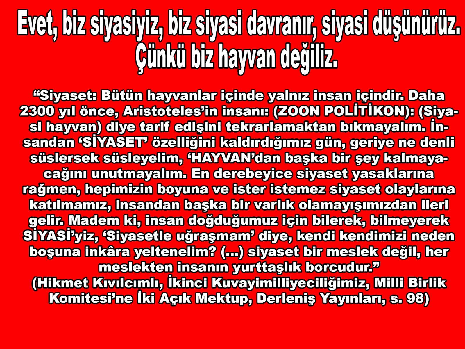 “Siyaset: Bütün hayvanlar içinde yalnız insan içindir. Daha 2300 yıl önce, Aristoteles’in insanı: (ZOON POLİTİKON): (Siyasi hayvan) diye tarif edişini tekrarlamaktan bıkmayalım. İnsandan ‘SİYASET’ özelliğini kaldırdığımız gün, geriye ne denli süslersek süsleyelim, ‘HAYVAN’dan başka bir şey kalmayacağını unutmayalım. En derebeyice siyaset yasaklarına rağmen, hepimizin boyuna ve ister istemez siyaset olaylarına katılmamız, insandan başka bir varlık olamayışımızdan ileri gelir. Madem ki, insan doğduğumuz için bilerek, bilmeyerek SİYASİ’yiz, ‘Siyasetle uğraşmam’ diye, kendi kendimizi neden boşuna inkâra yeltenelim? (…) siyaset bir meslek değil, her meslekten insanın yurttaşlık borcudur.” (Hikmet Kıvılcımlı, İkinci Kuvayimilliyeciliğimiz, Milli Birlik Komitesi’ne İki Açık Mektup, Derleniş Yayınları, s. 98)
